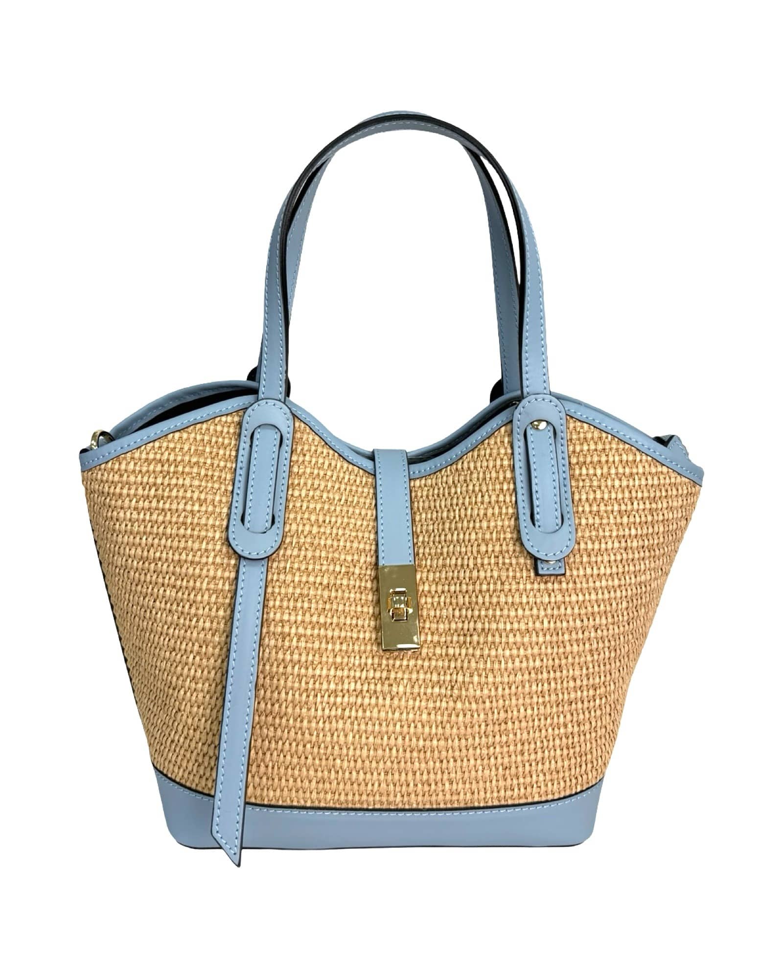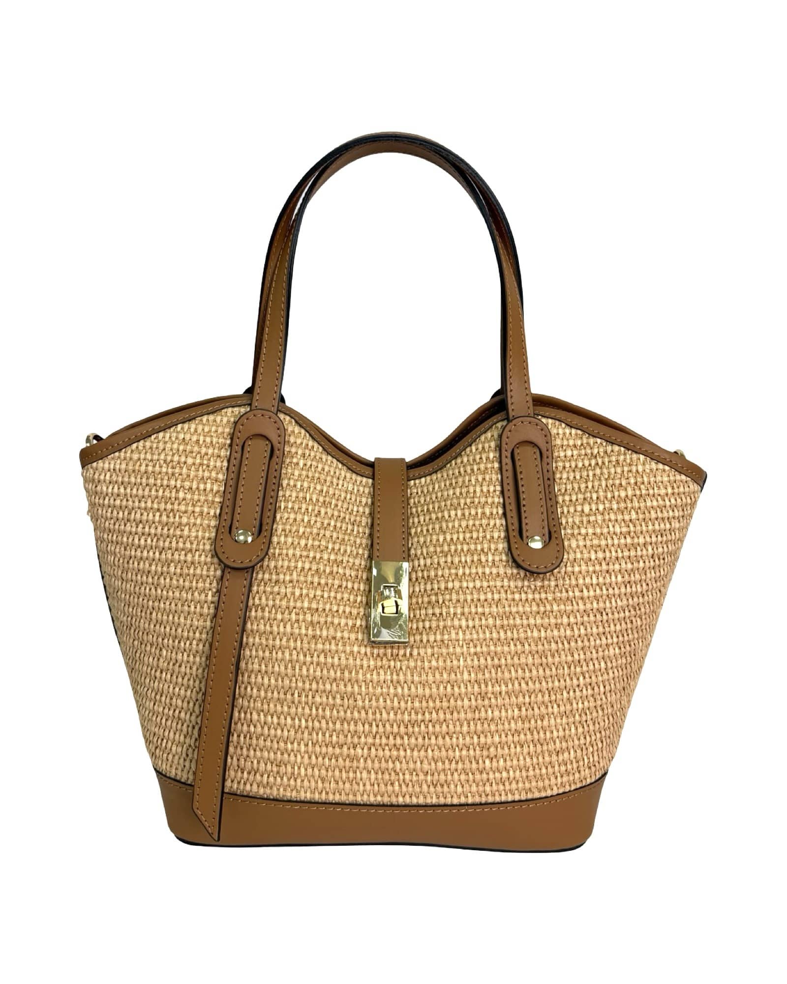 Outer Material: Raffia and leather edges with gold accessories on the front