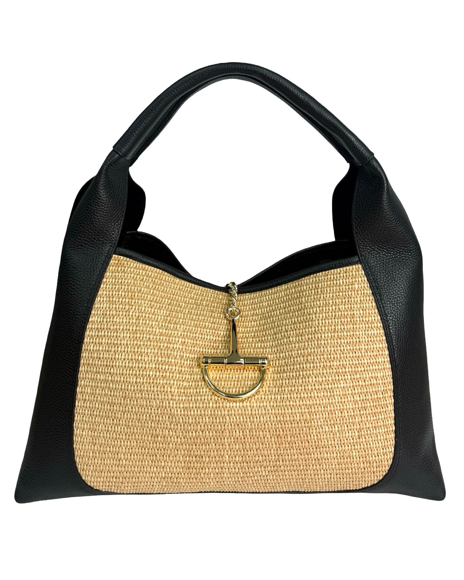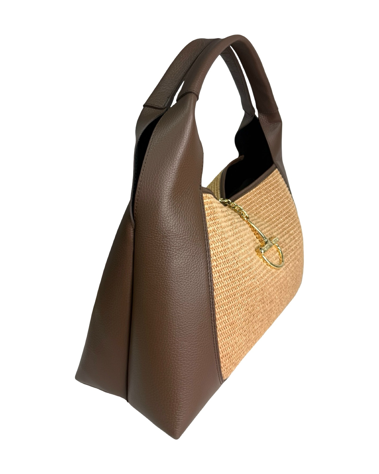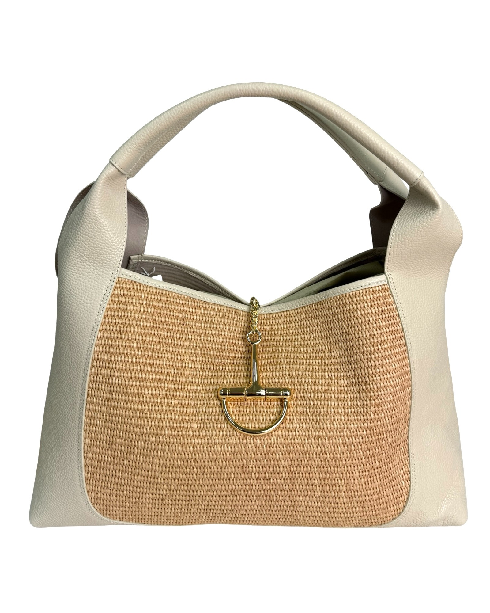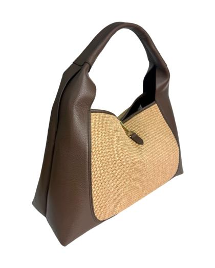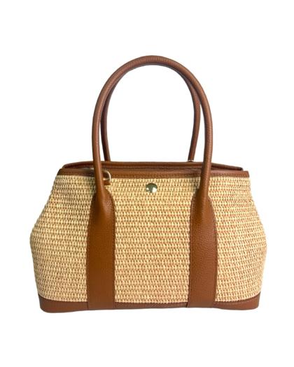 Outer material: genuine leather and raffia with gold-coloured flap closure
