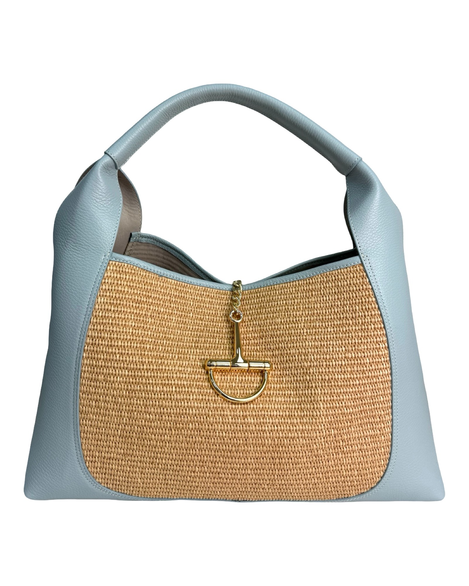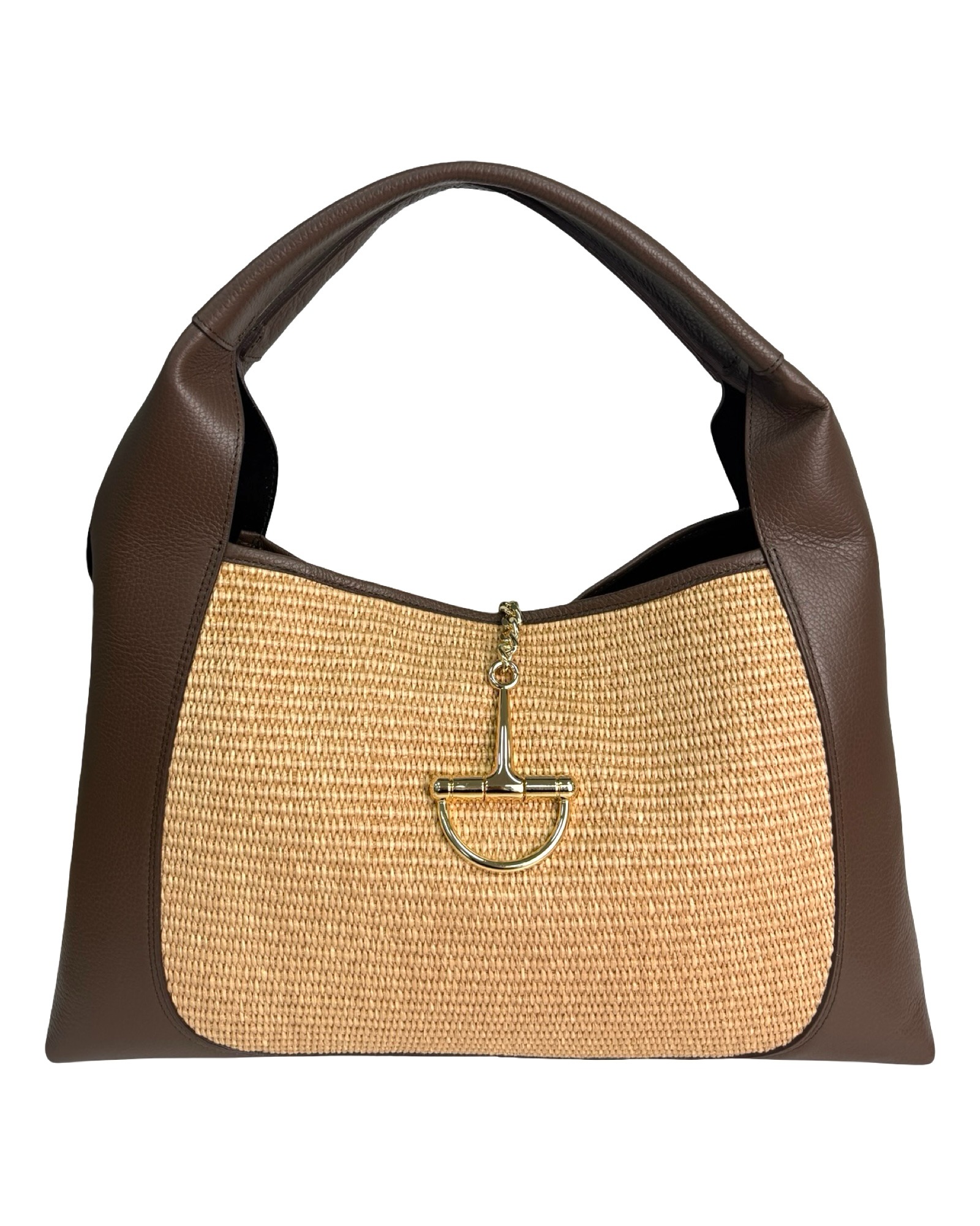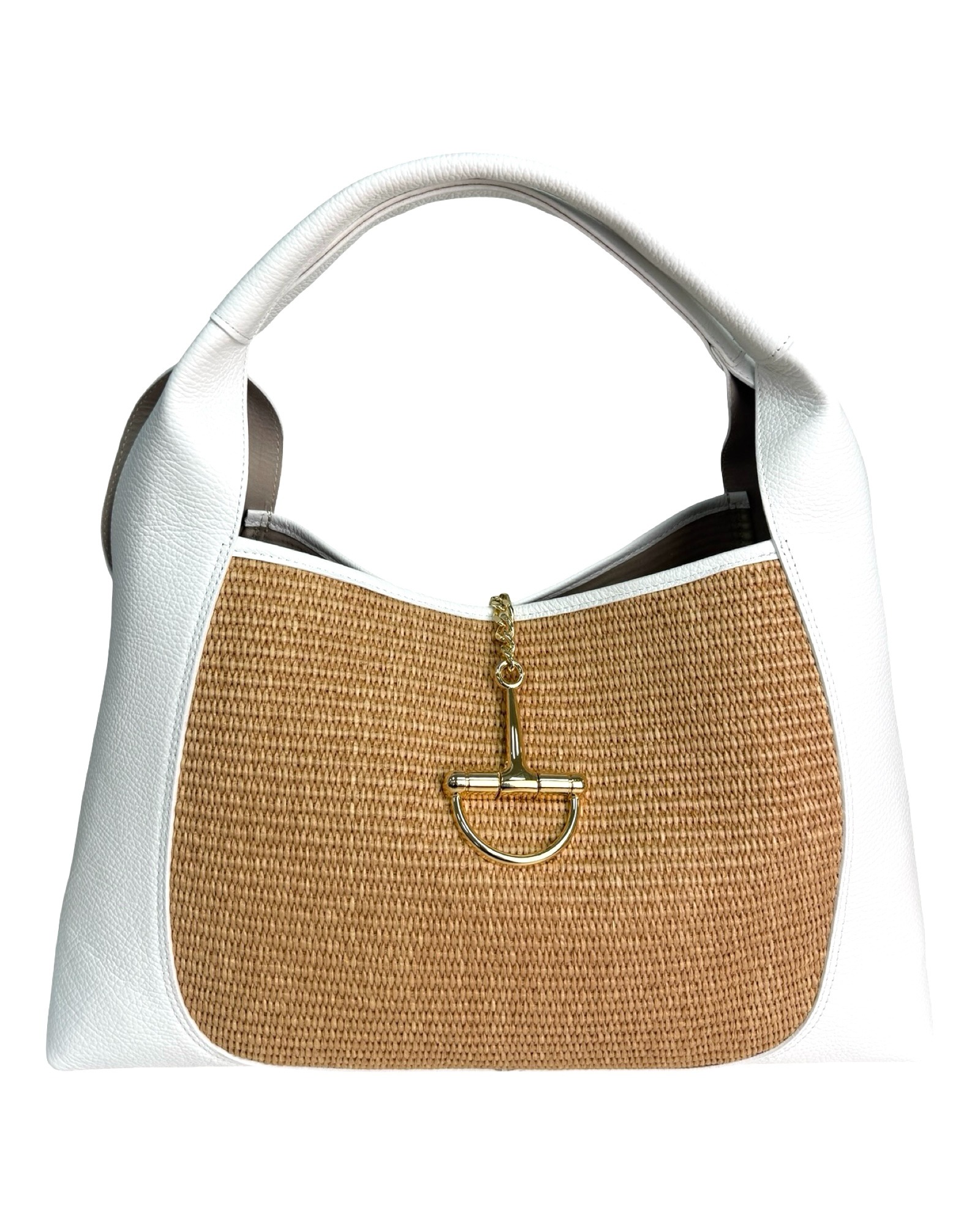 Outer material: genuine leather and raffia with gold-coloured flap closure