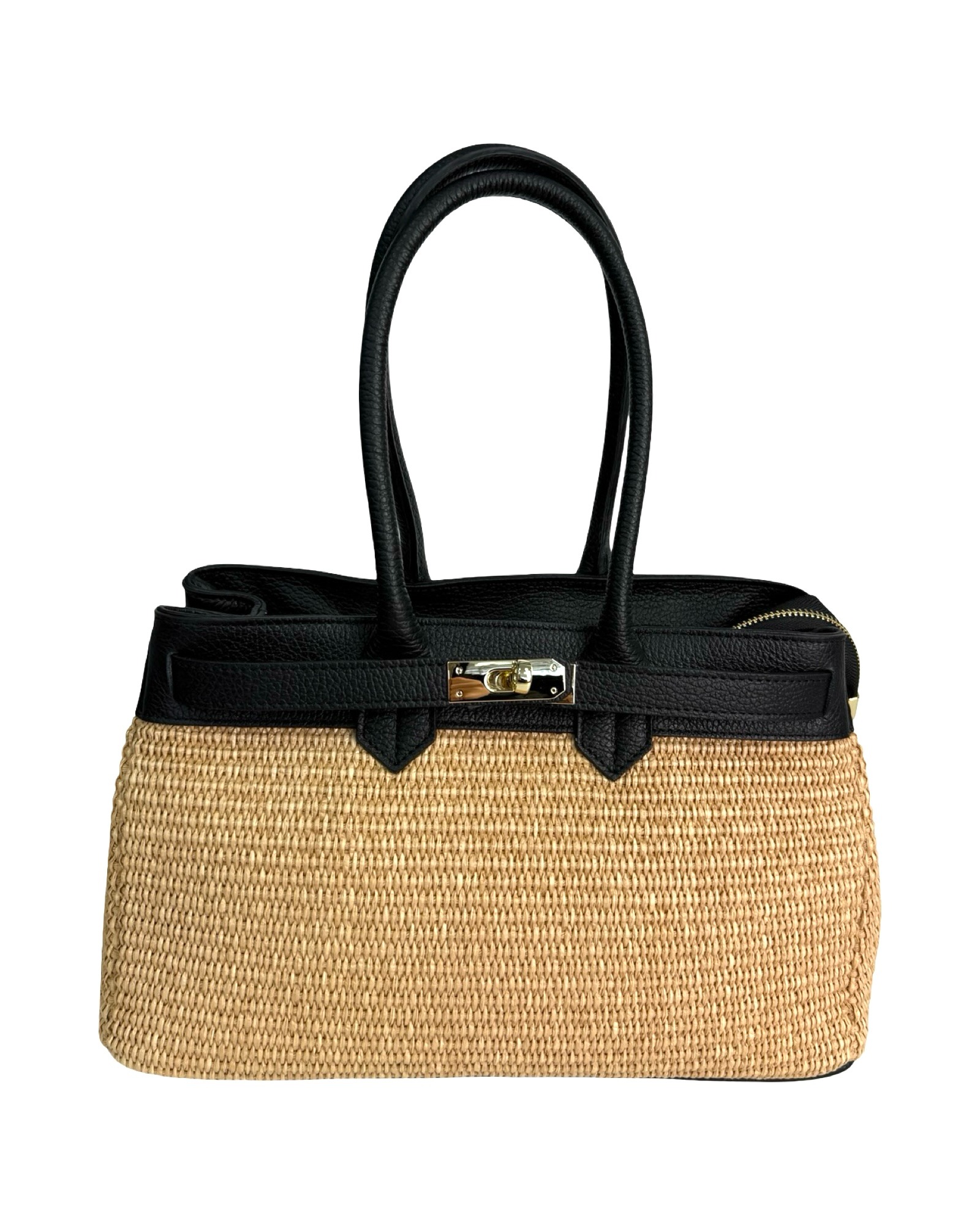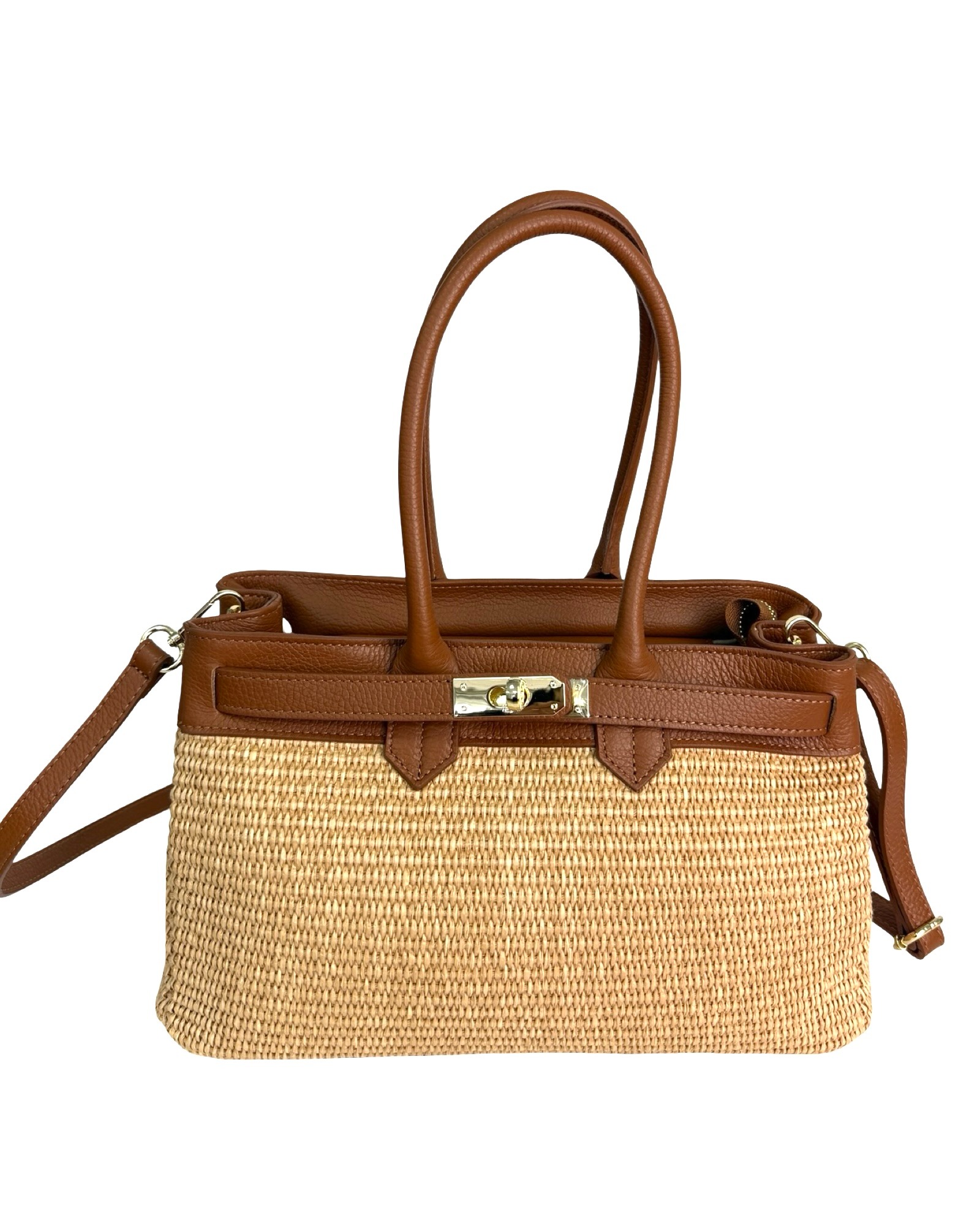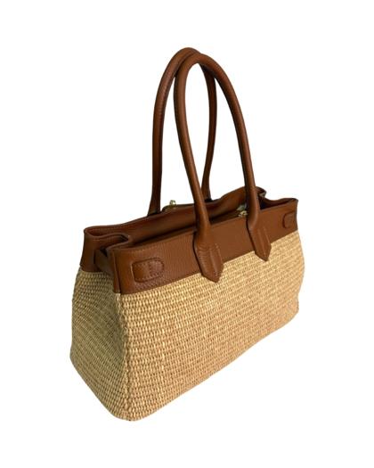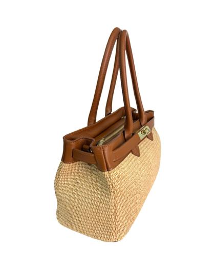 Outer material: genuine leather and raffia with gold flap closure