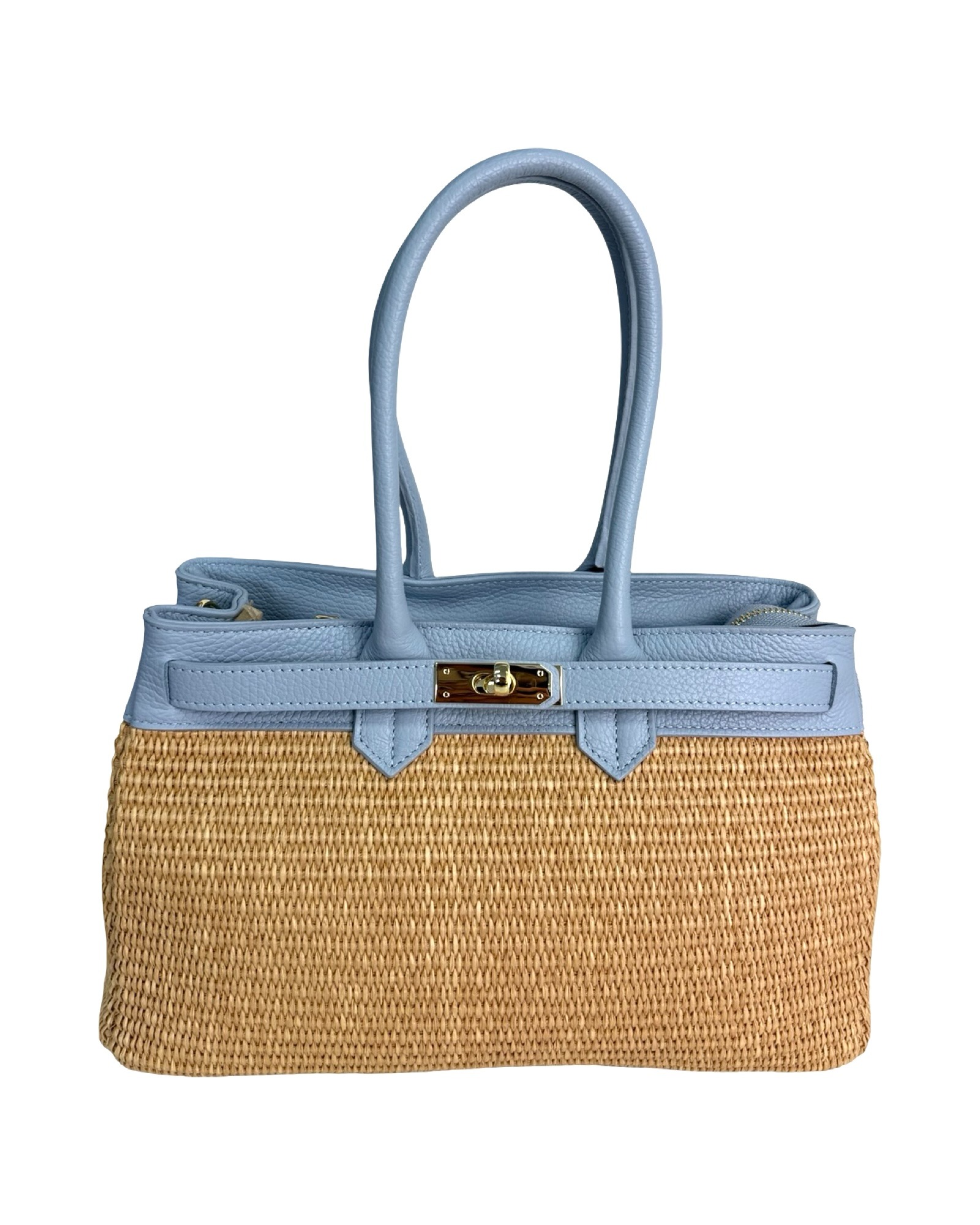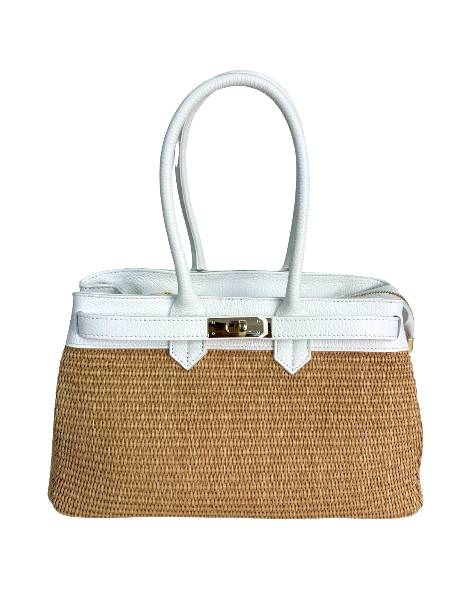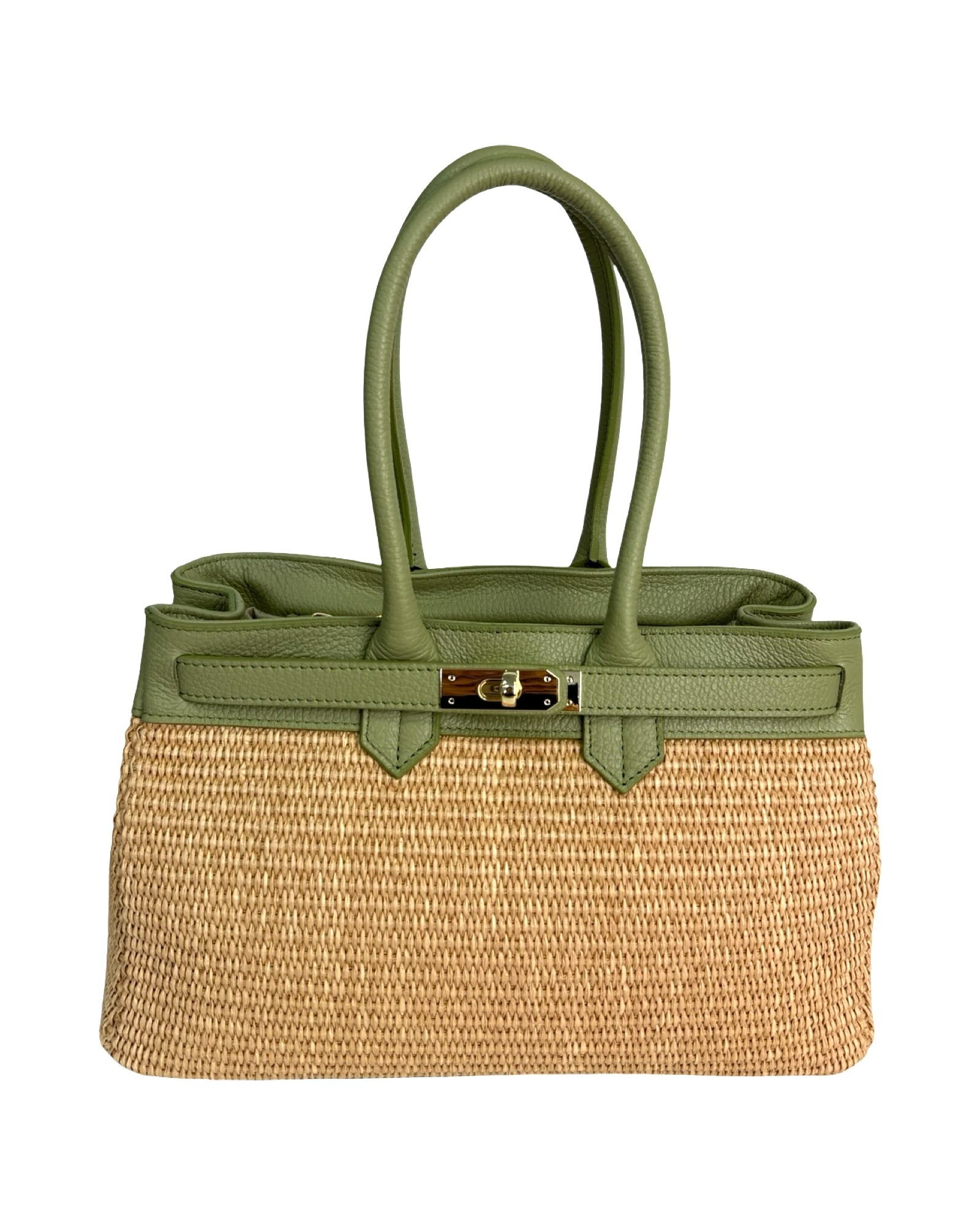Outer material: genuine leather and raffia with gold flap closure