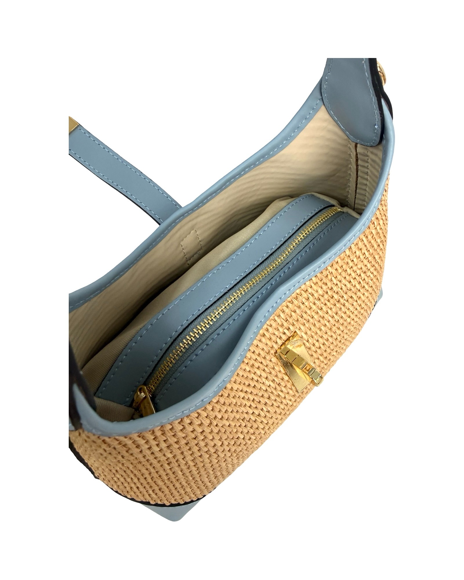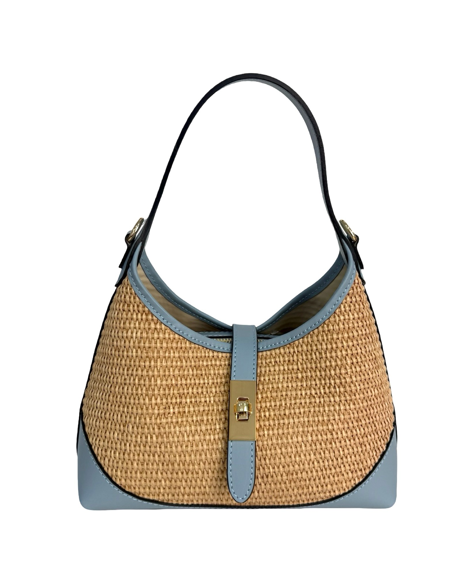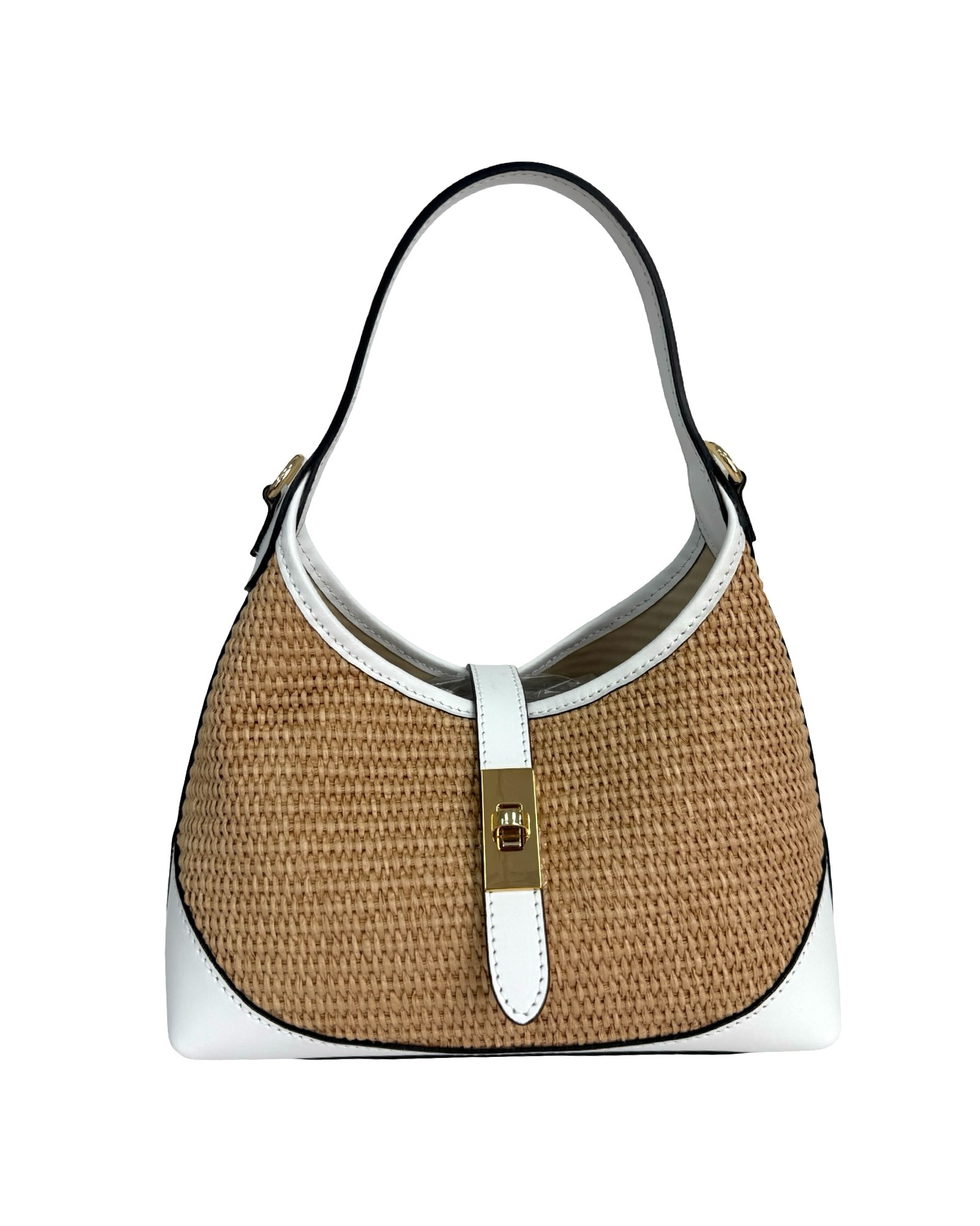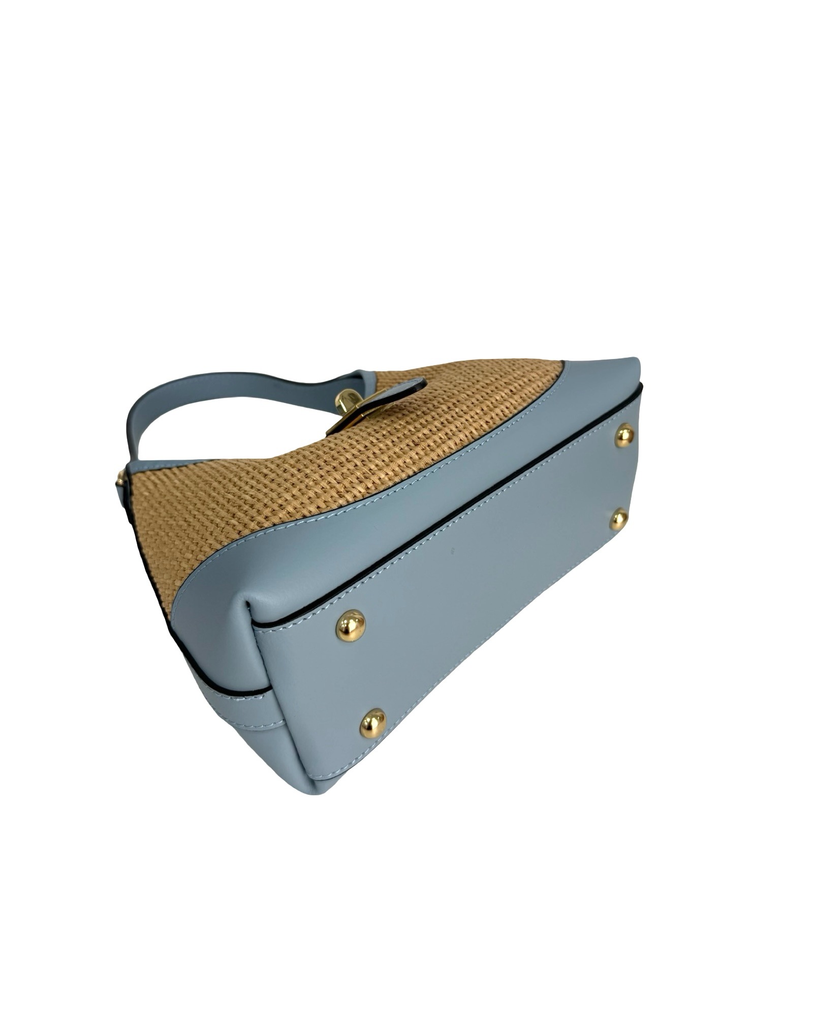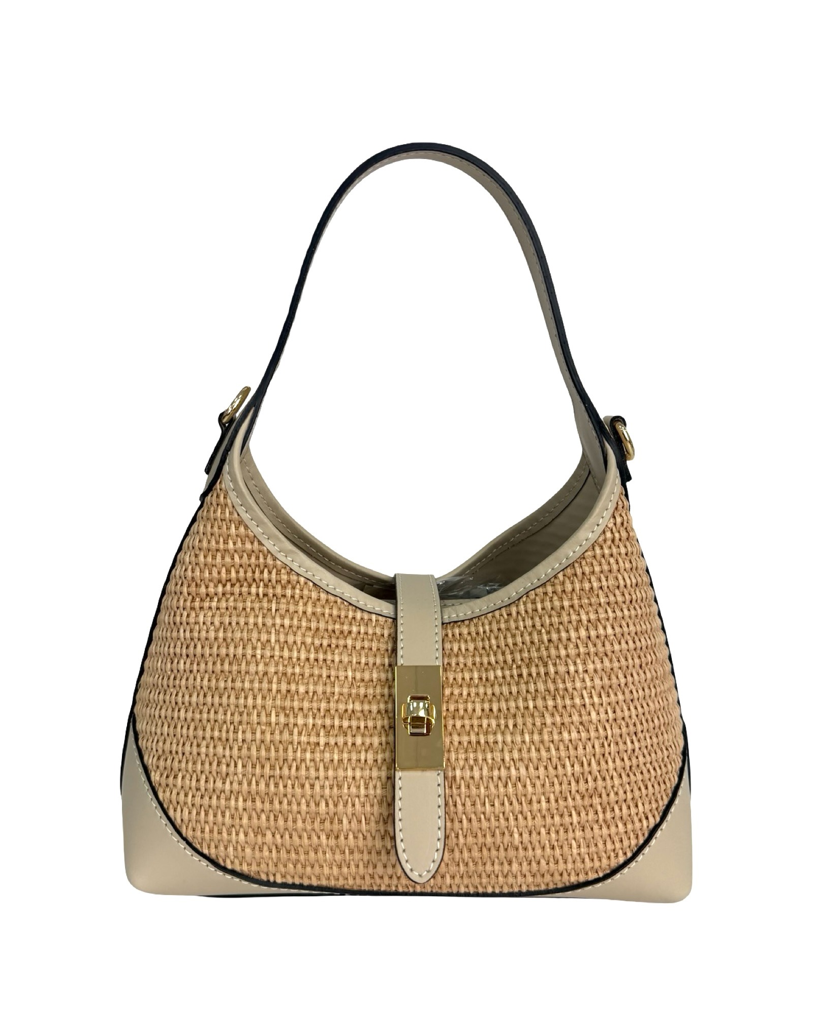 Outer Material: Raffia and leather edges with gold accessories on the front