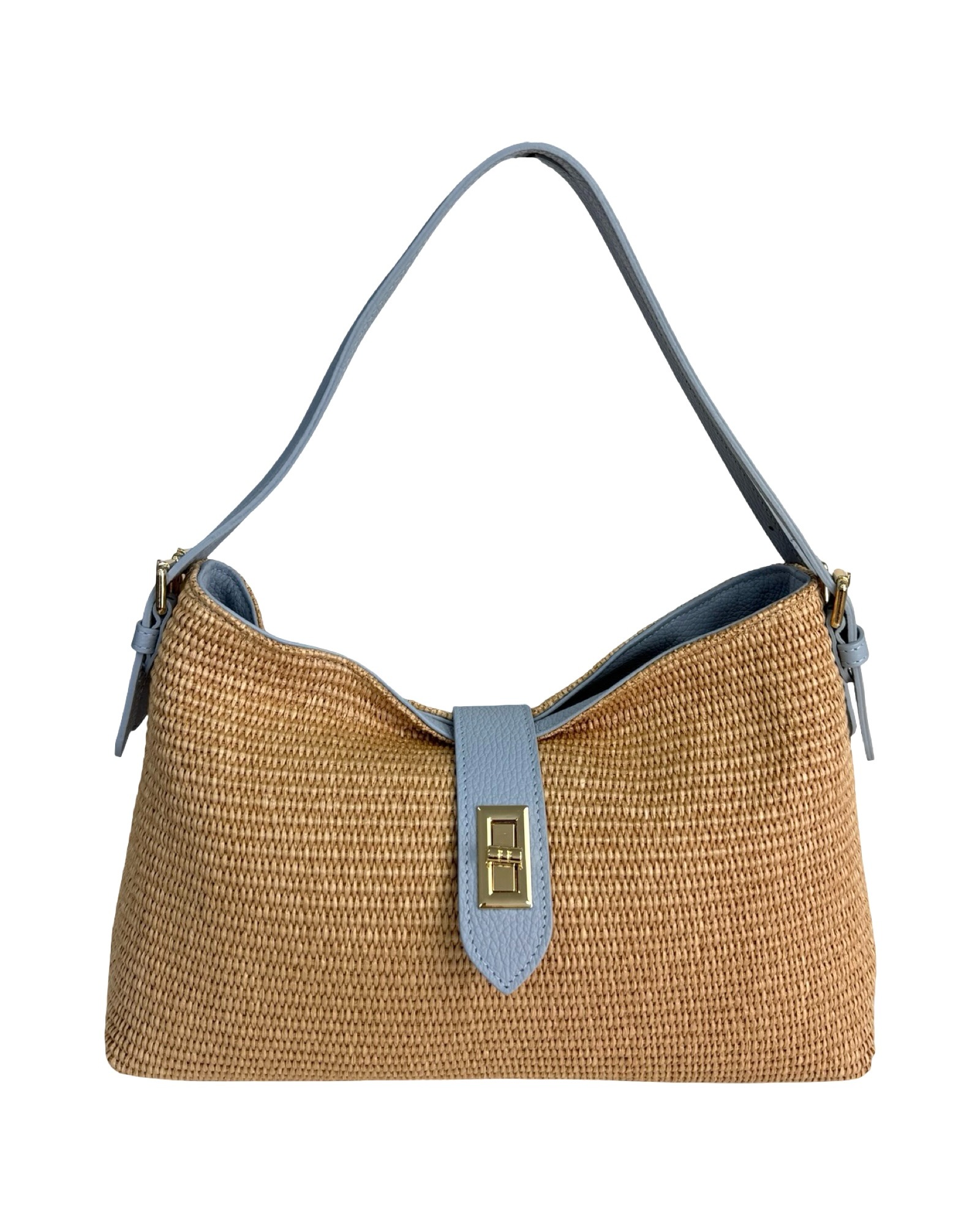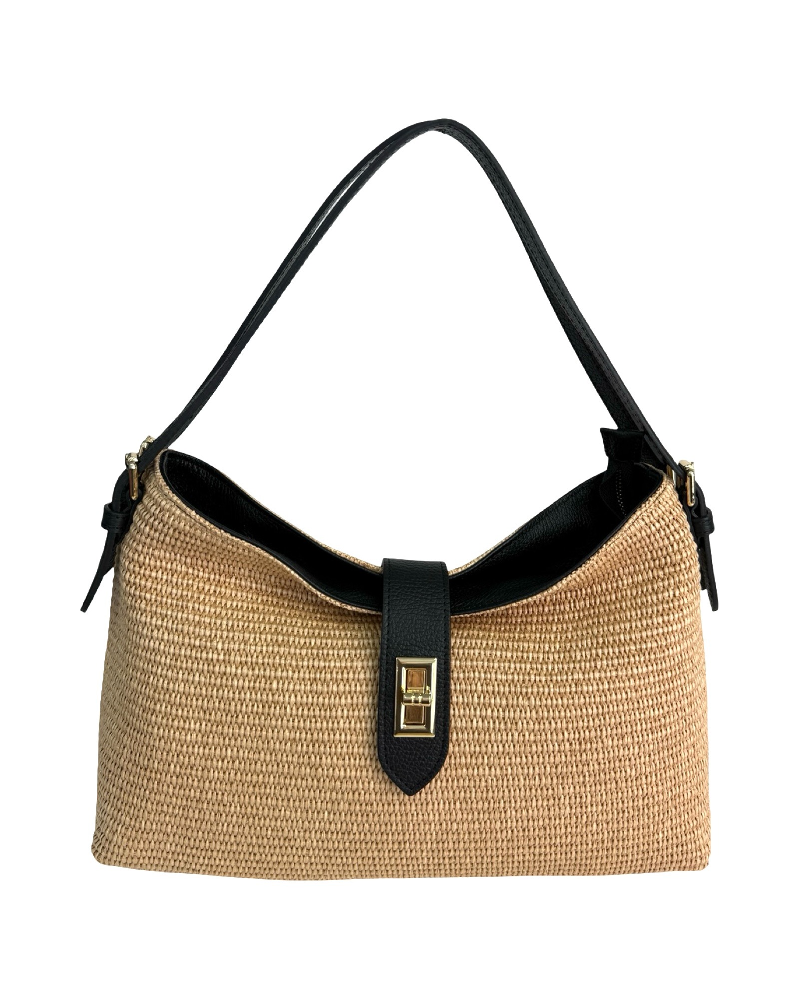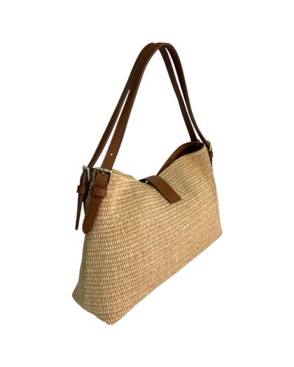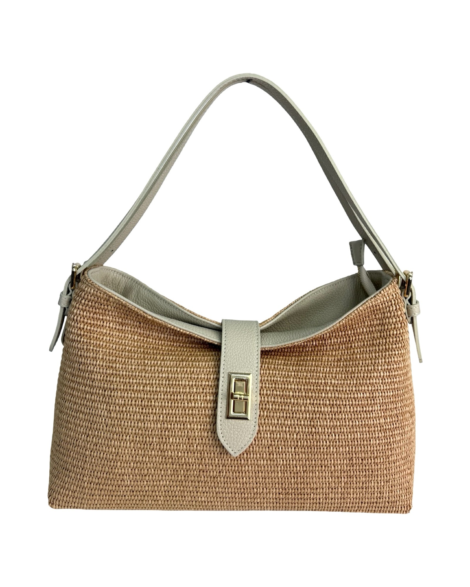 Outer material: genuine leather and raffia with gold flap closure