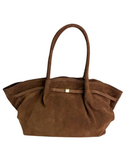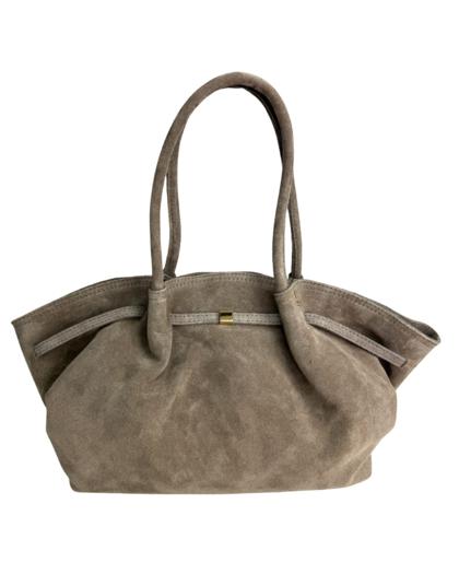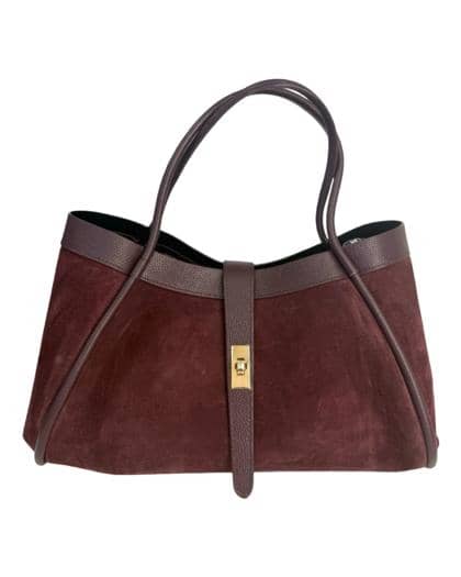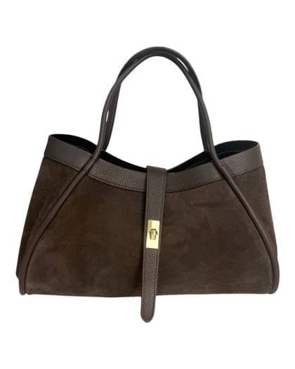 Material exterior: Piel auténtica con dos asas de piel con anillas doradas.