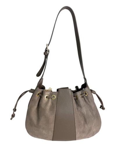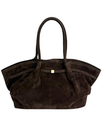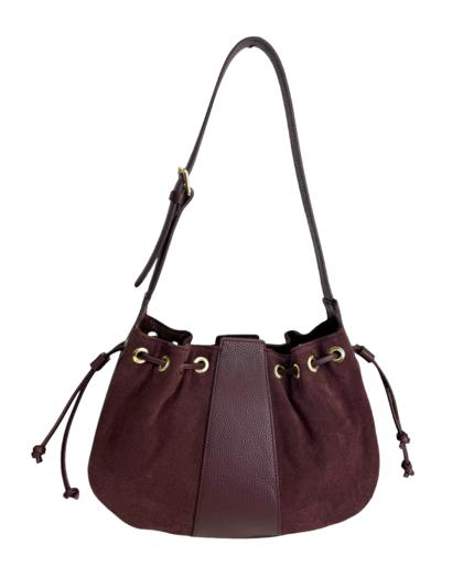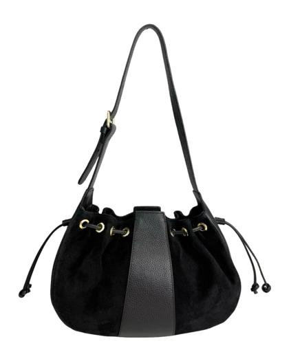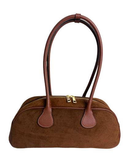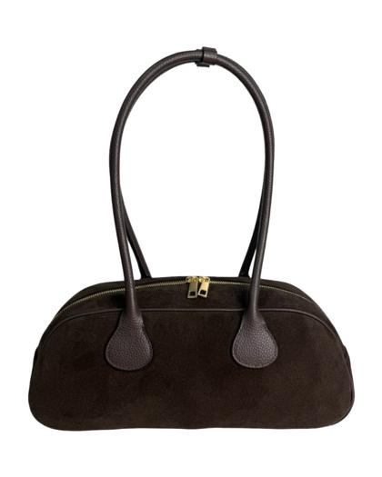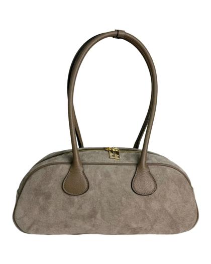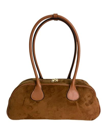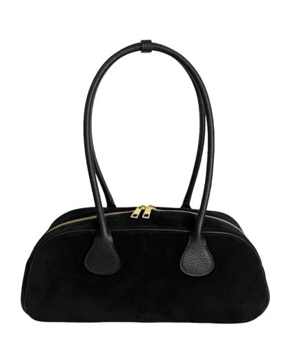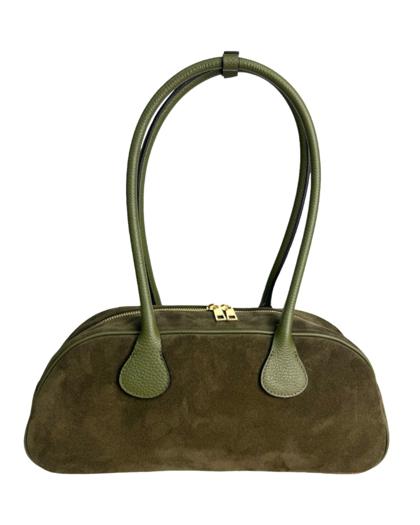Material exterior: piel de ante auténtica con cierre de cremallera y solapa dorada.