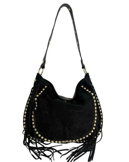 Material exterior: piel auténtica y ante con flecos laterales y tachuelas.