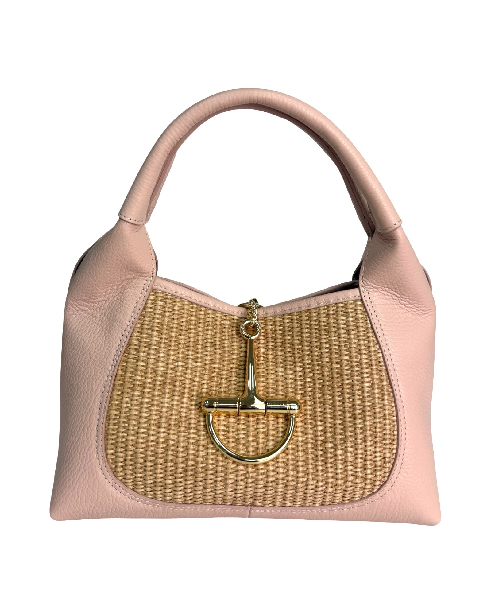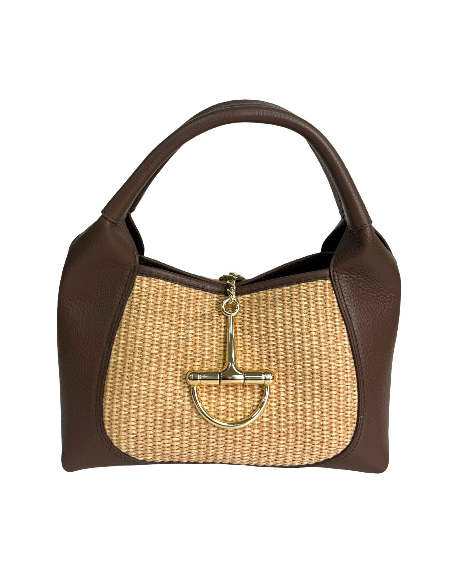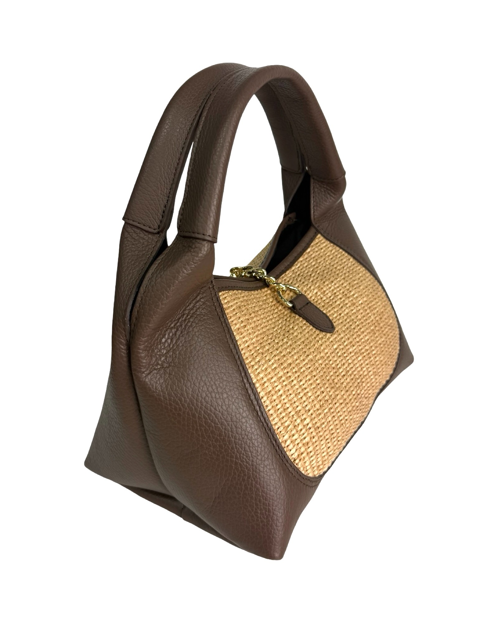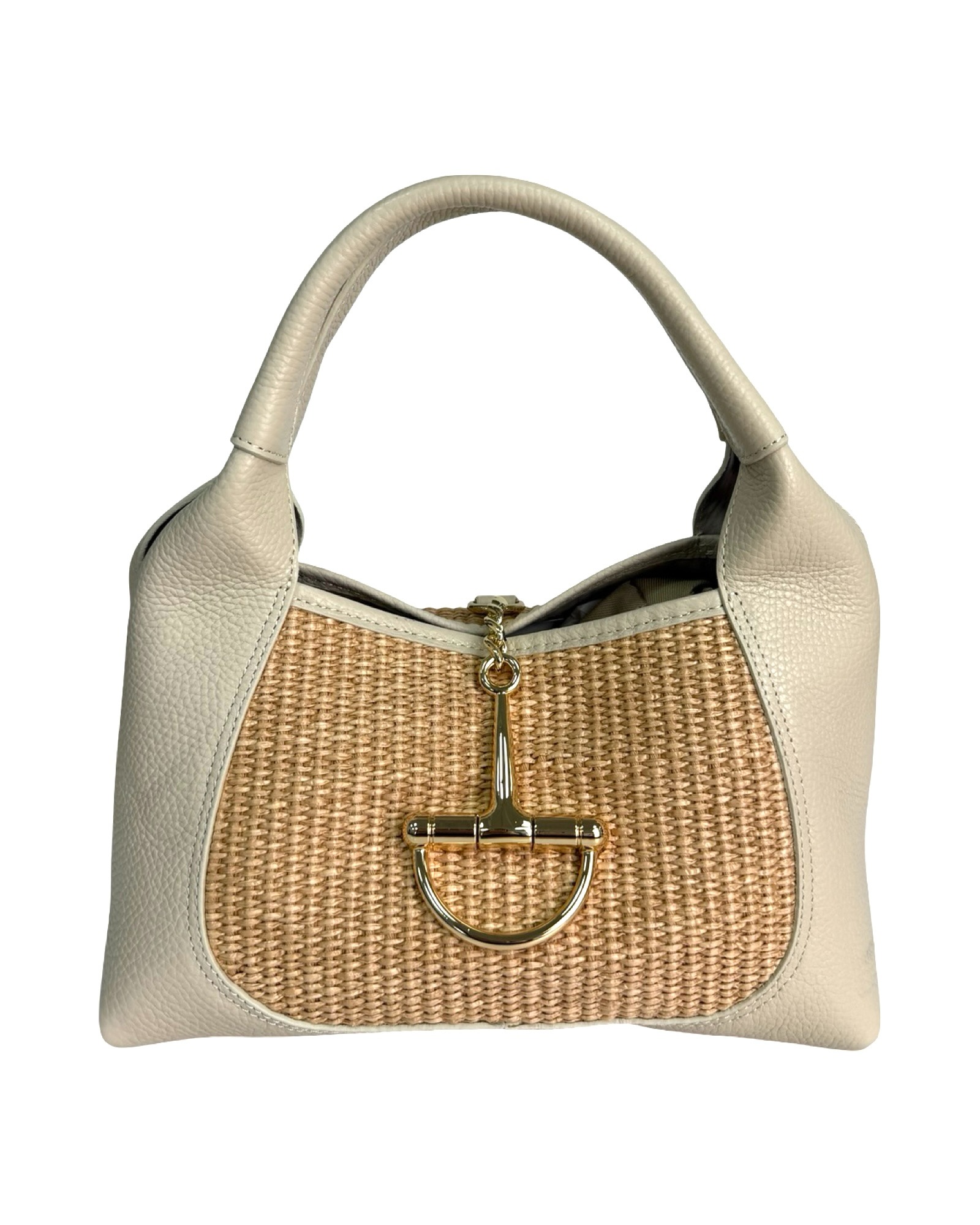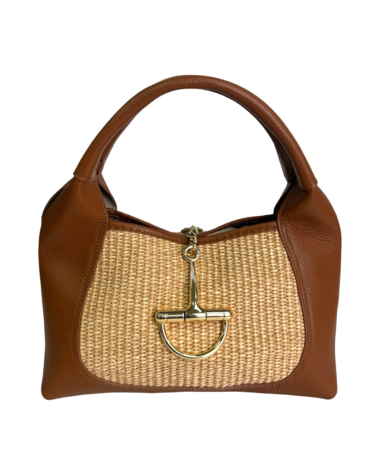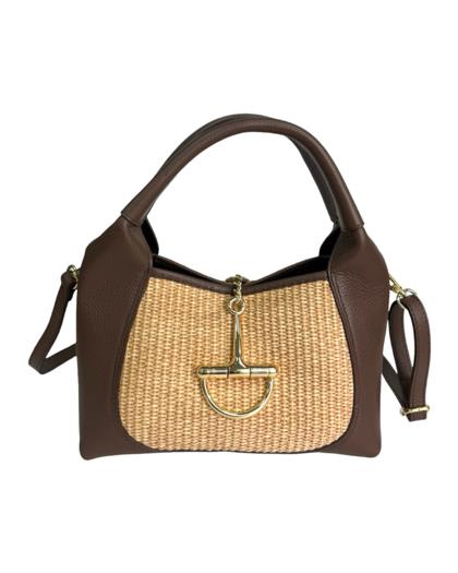 Outer material: genuine leather and raffia with gold-coloured flap closure