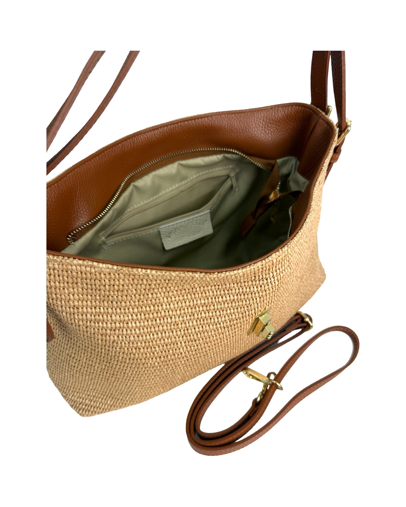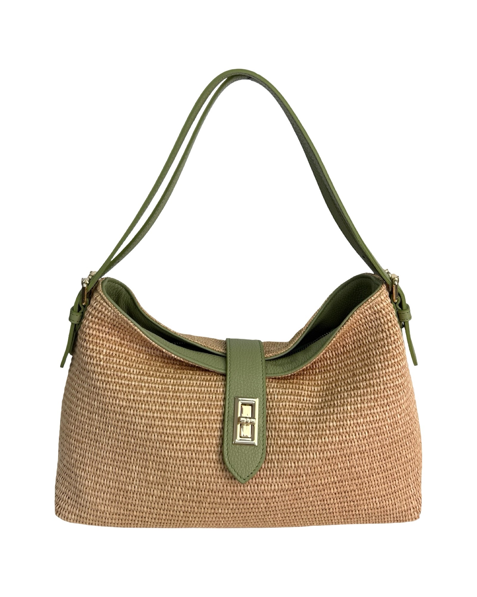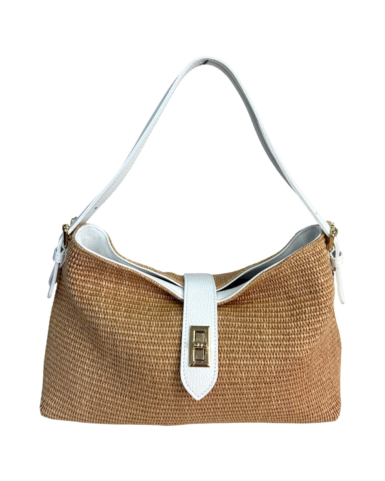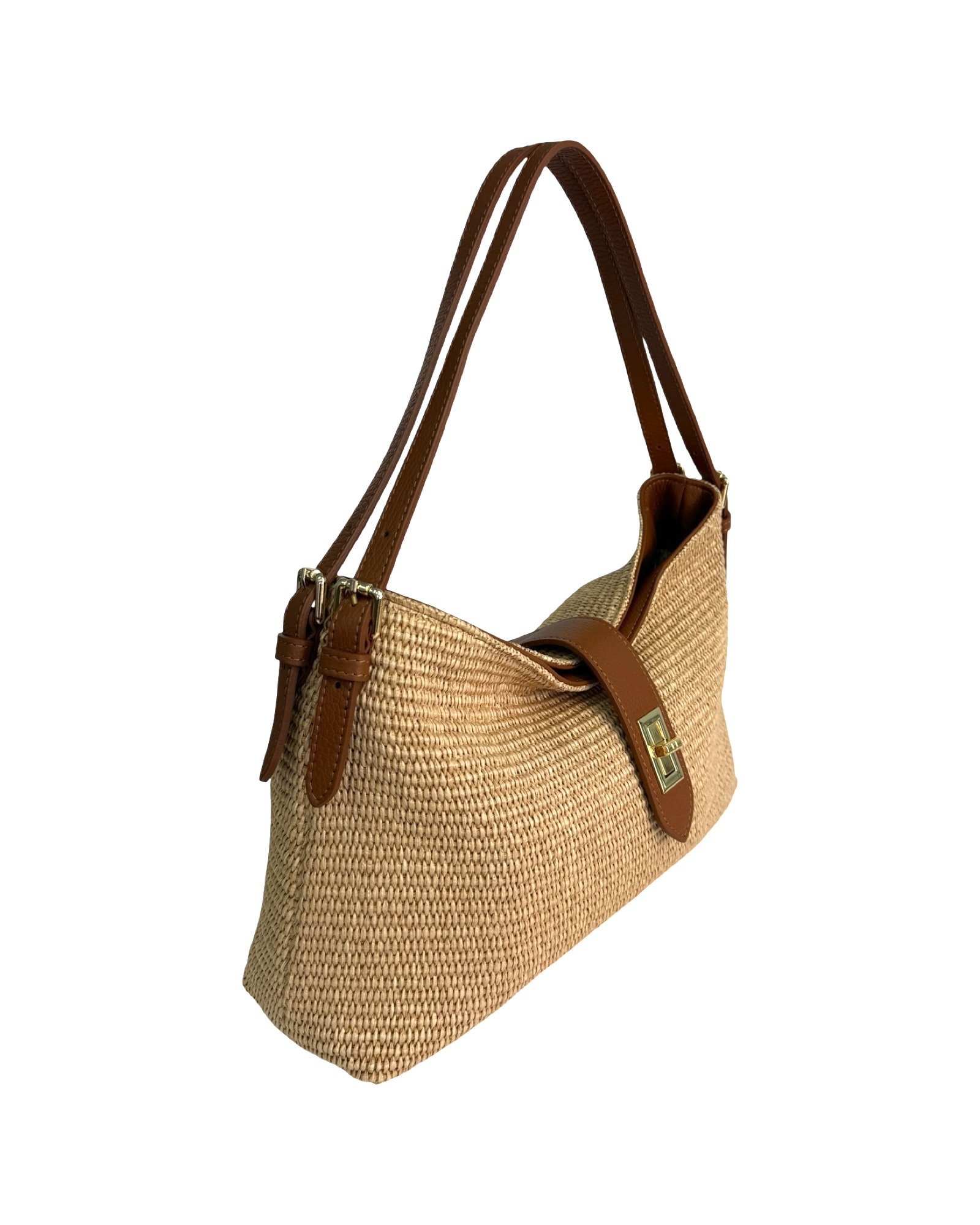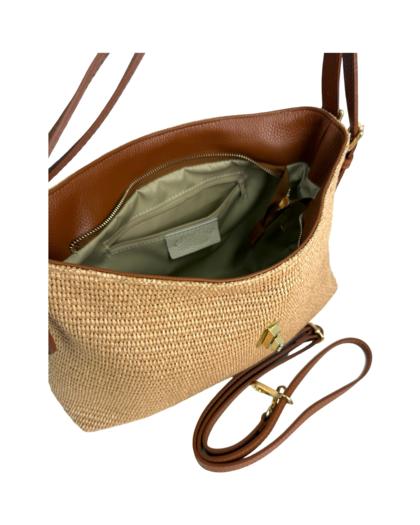Outer material: genuine leather and raffia with gold flap closure